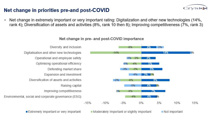 能源咨詢公司Crystol Energy和艾斯本于本月剛剛完成一項針對220家公司的調(diào)查。報告顯示,18%的公司在比較疫情前后的數(shù)字化重點時發(fā)現(xiàn),他們對數(shù)字化的關(guān)注度明顯提高。